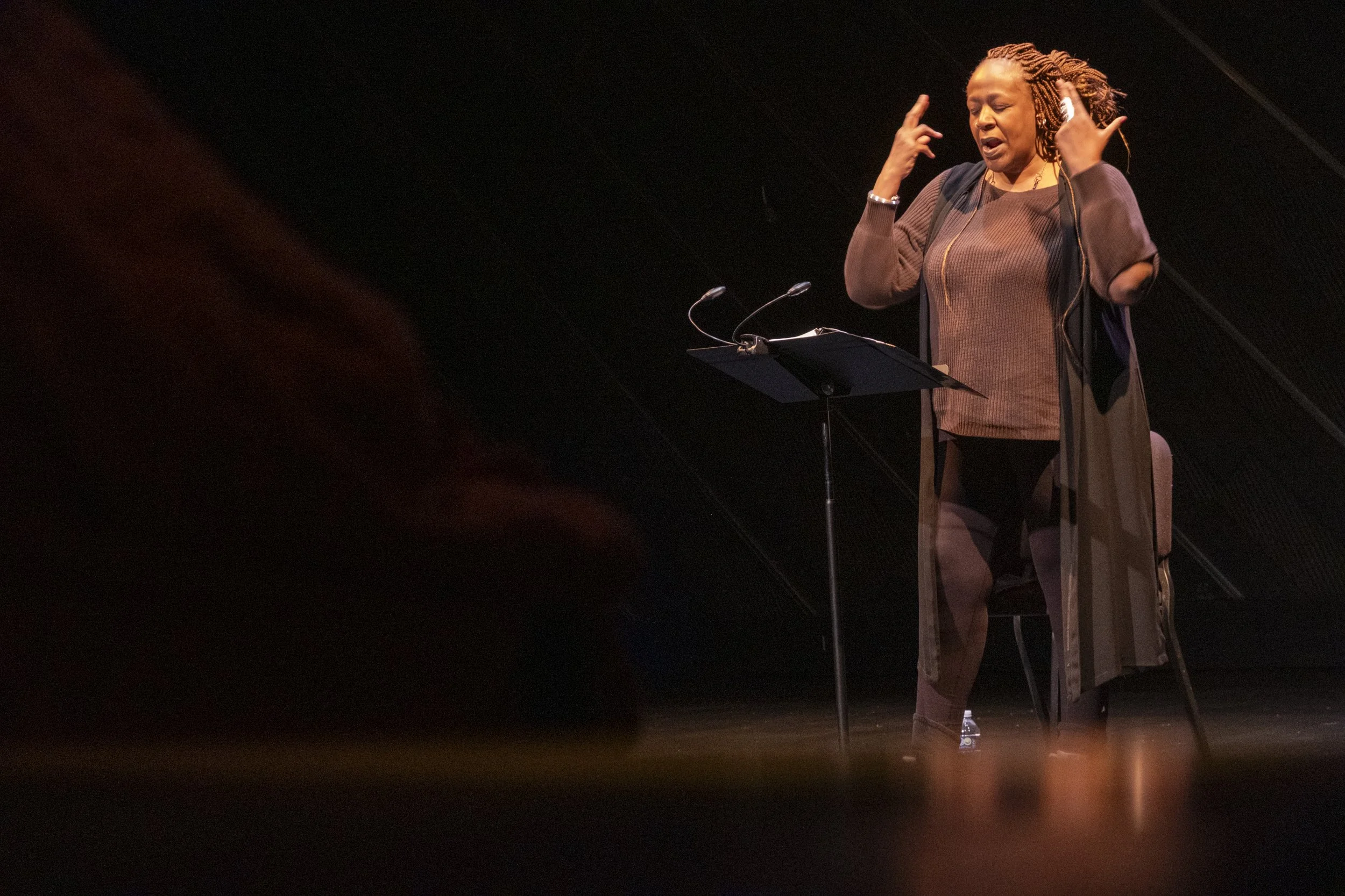 A series of images depicting the reading of short stories to an audience attending the Marinoff Theater at Shepherd University.